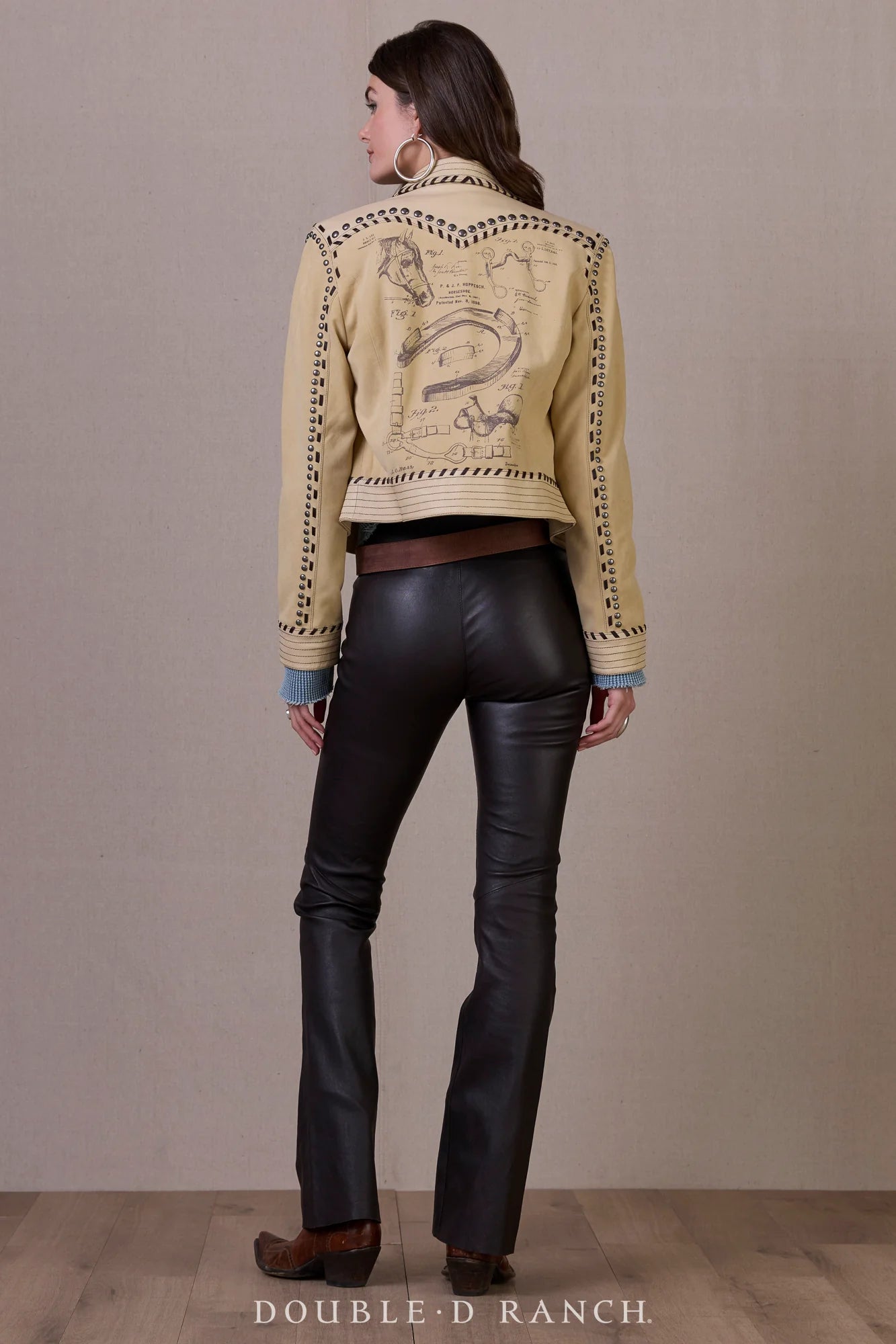 Actually, a lot of detail, but we couldn’t resist the play on words to emphasize all the cool blueprint-style sketches of different pieces of tack that give this jacket it’s stable-ready vibes that say, “I came here for the horses.” It’s a gorgeous two-tone combination of goat suede leather in a classic zip-front silhouette, accented by bold contrast stitching and studded trim. A true cowgirl classic.