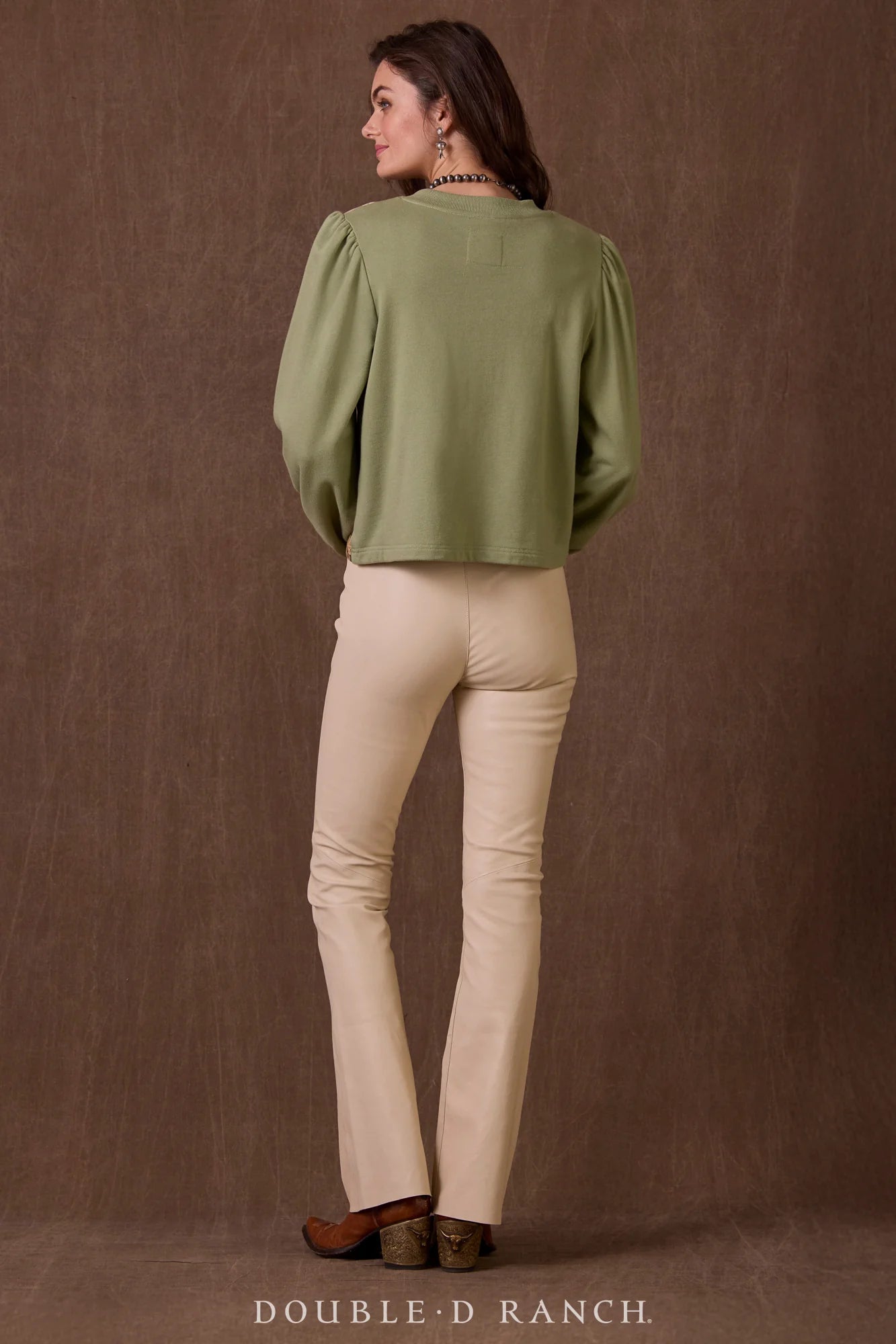 It’s *sort of* a sweatshirt, but we wouldn’t feel right calling it that – it’s just too lovely. The soft shade of ‘mineral’ green beautifully complements the incorporated image of Maura Allen’s art on the bodice, and the elements of cropped waist, puffed sleeve, and laced neckline add a unique femininity.