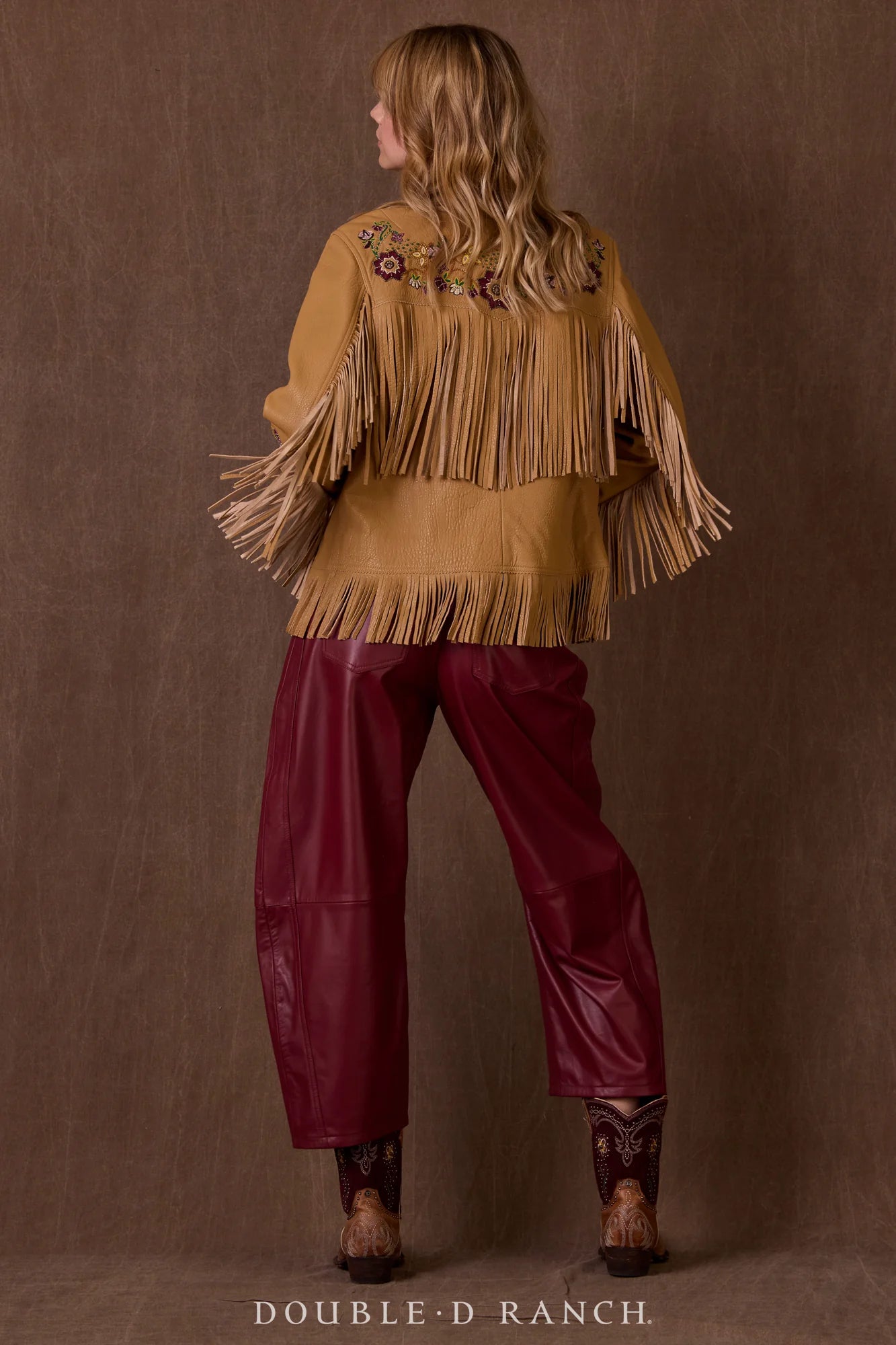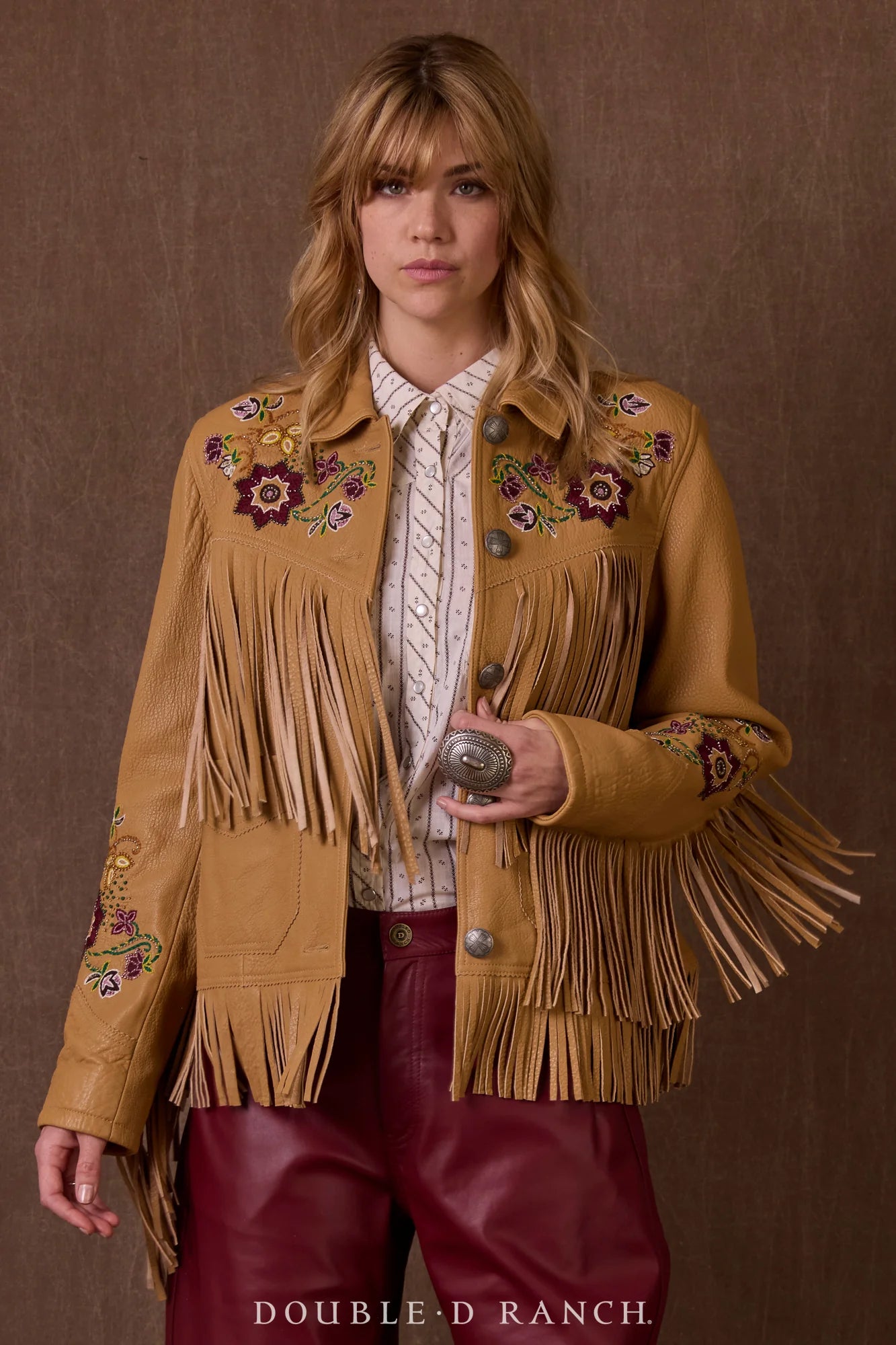 We are absolutely enamored with this beauty. The super-soft sheepskin leather is a universally appealing hue (‘doe’), and it’s embellished with exquisite embroidery and beautiful beadwork in gorgeous gem tones and a lovely motif of prairie florals. It’s finished with classic concho buttons, and extra-long 360-degree fringe for some fabulous movement – you’re definitely going to make a lasting impression in this one!